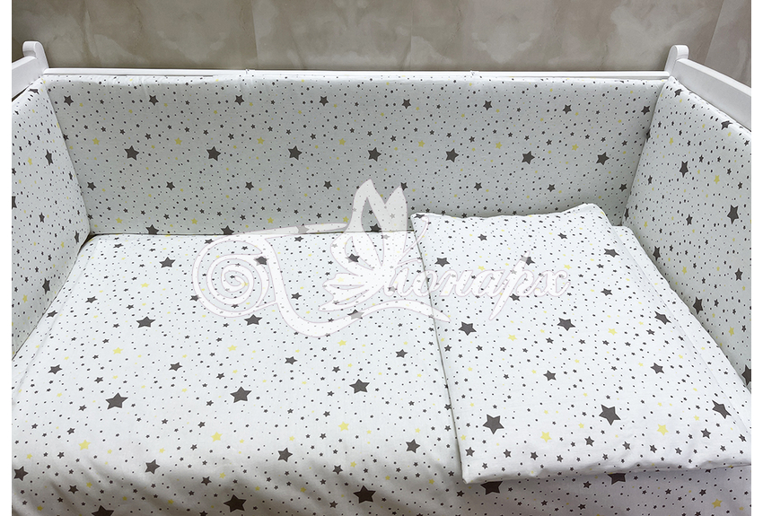 Бортики СО СЪЕМНЫМИ ЧЕХЛАМИ в кроватку: защитят Вашего малыша от ушибов, сквозняков, солнечных лучей и не дадут малышу запутаться в прутьях кроватки. - Простыня на резинке 60х120 см (подходит для стандартной кроватки)